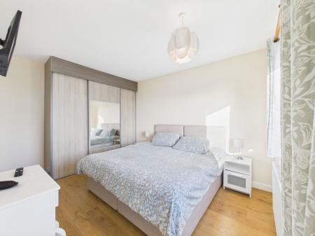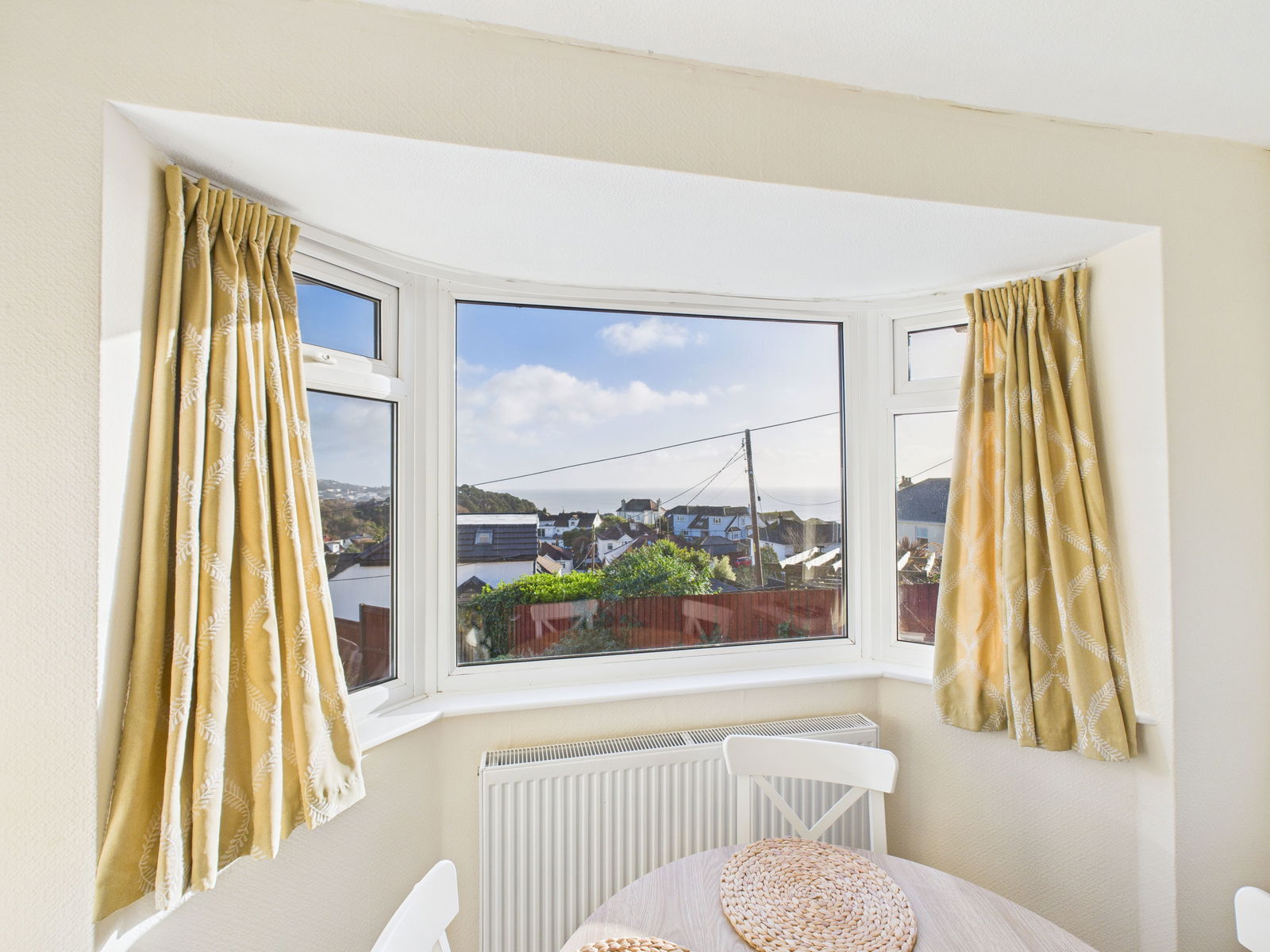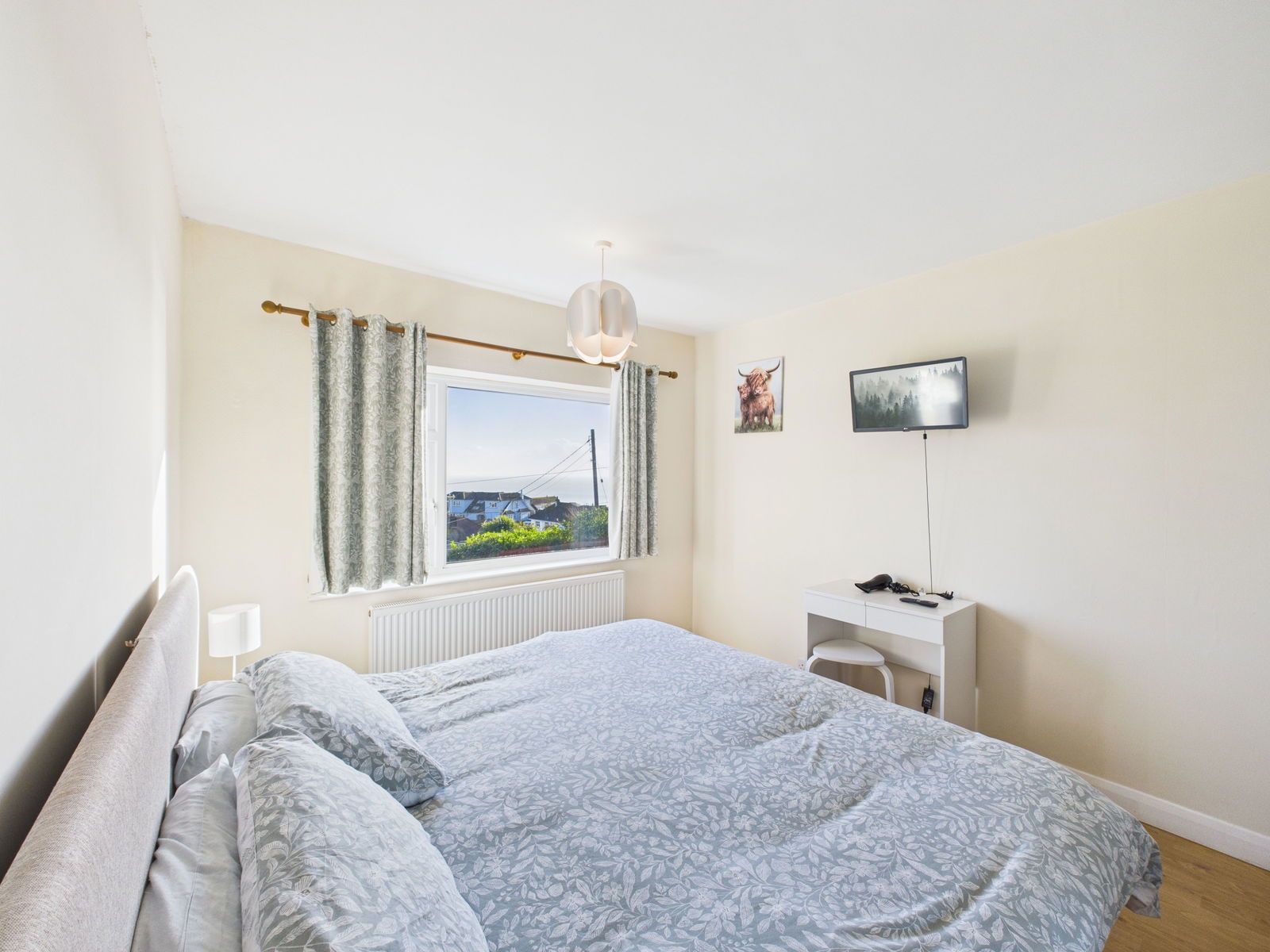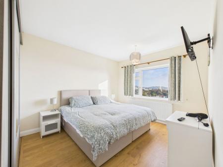 BEDROOM ONE Front-facing window with partial sea views, fitted wardrobes, radiator and power points.