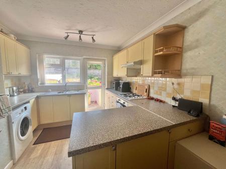 KITCHEN/BREAKFAST ROOM - 4.62m x 3.07m (15'1" x 10'0") maximum. Fitted kitchen comprising inset stainless steel one and a half bowl sink and drainer unit. Range of wall and base units with roll edged work surfaces. Tiled surrounds. Inset gas hob with built in electric oven and grill below and extractor hood over. Peninsula unit with space for fridge and space and plumbing for washing machine under. Space for breakfast table and chairs. Double glazed window and door to rear. Radiator.