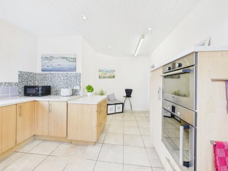 KITCHEN The kitchen features tiled flooring, spot lighting, a dual electric oven, electric hob with extractor, integrated fridge freezer, and built-in dishwasher. A radiator provides warmth, and the layout offers plenty of storage and workspace.