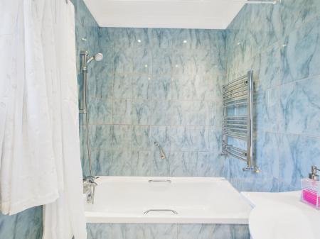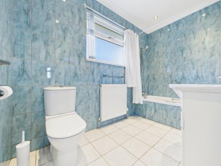 FAMILY BATHROOM Also fully tiled, with a bath and overhead shower, vanity basin, WC, heated towel rail, and radiator.