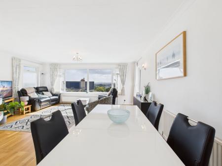 LOUNGE The main living room is finished with engineered wood flooring, three radiators, and an electric fireplace. Large uPVC windows capture outstanding sea views, and a door onto a balcony with wooden decking and glass balustrades overlooking the bay.