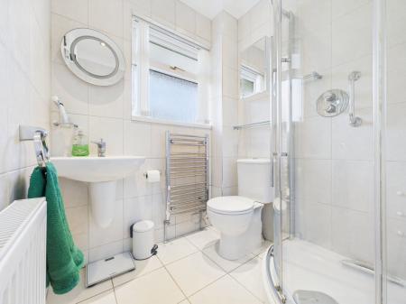 SHOWER ROOM Fully tiled with walk-in shower, vanity basin, WC, heated towel rail, and radiator.