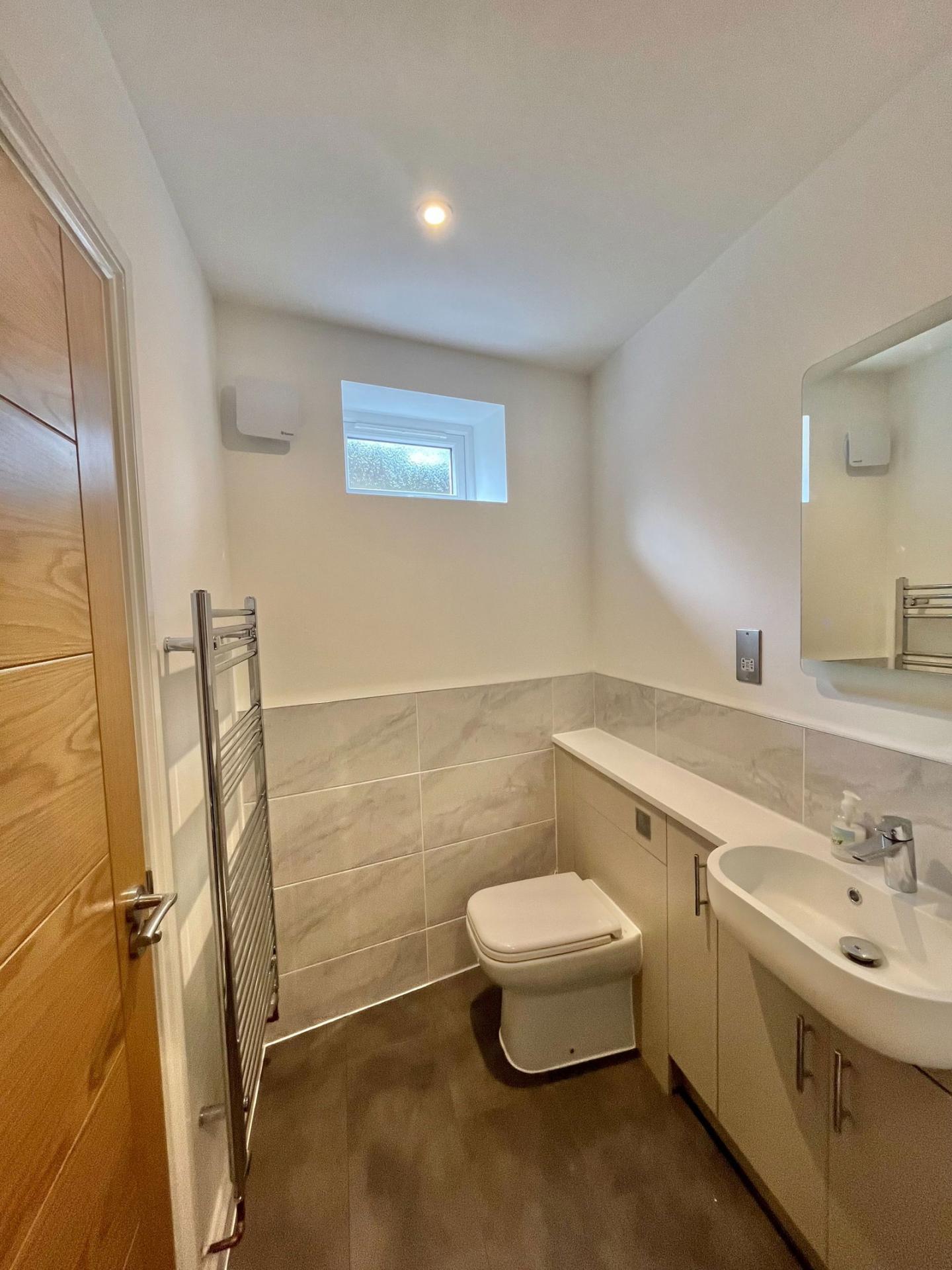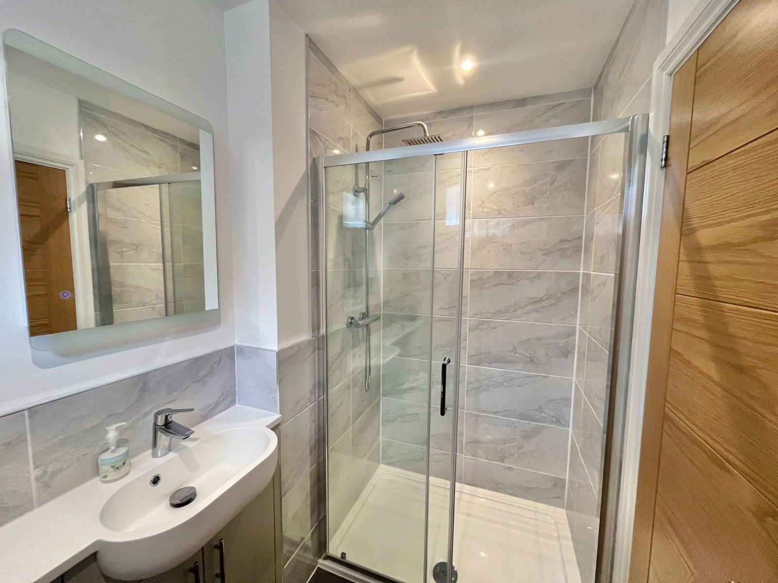EN-SUITE Recently fitted luxury suite comprising double shower cubicle with sliding glass doors. Mains shower with rain head. Curved ceramic sink built into bathroom shelf and integrated WC and bathroom cupboards. Chrome heated towel rail. UPVC double glazing. Mostly tiled. Extractor fan. Shaver socket. Mirror with back lighting.