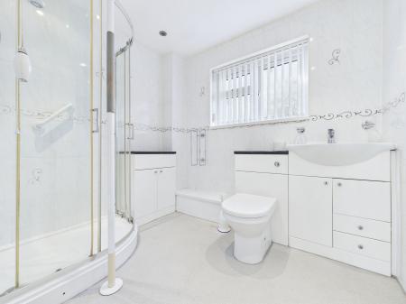SHOWER ROOM Large shower cubicle. Vanity basin with cupboard and drawers. Close coupled WC. Fully tiled.