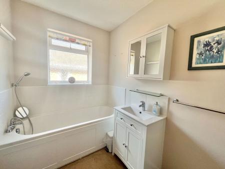 FAMILY BATHROOM White replaced quality suite comprising bath with mixer taps, vanity basin, shower cubicle with mains shower and central heating radiator. uPVC double glazing.