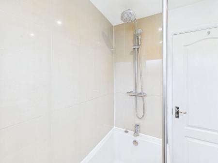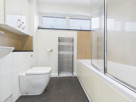BATHROOM 7' 07" x 6' 01" (2.31m x 1.85m) Panelled bath with mixer tap, tiled surrounds, circular shower head with rinsing shower and mixer tap, bi-folding shower screen. Vanity style wash hand basin with inset granite work top with white high gloss drawers, cupboards under and further range of matching wall mounted units. Close coupled W.C. Heated chrome towel rail. uPVC double glazed window to rear.