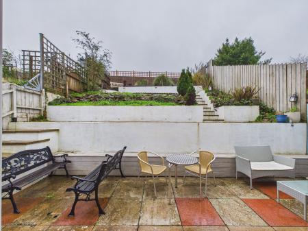 REAR Adjacent to the property is a level patio being an ideal place to dine 'Al Fresco'. Outside water tap. Five steps lead up to brick paviored terrace with raised flower bed, rockery, further steps lead up to a gravelled pathway with further terrace laid to lawn. The garden is enclosed by close board fencing.