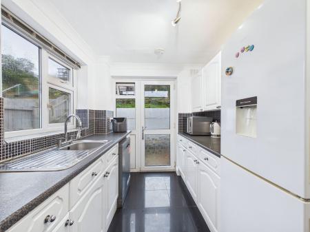 KITCHEN 12' 0" x 7' 1" (3.66m x 2.16m) Roll edge granite effect work surfaces to two walls with range of high gloss white fronted drawers, cupboards under. Range of matching wall mounted units over. Single drainer sink unit with mixer tap over. uPVC double glazed window to side. Recess gas cooker point, contemporary illuminated extractor over. Space for upright fridge/freezer. Recess, plumbing for dishwasher. Built-in deep recessed cupboard with shelving. uPVC double glazed door and window to side opening and giving access to and overlooking the rear garden. Ceramic tiled floor and electrical under floor heating.