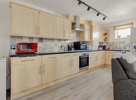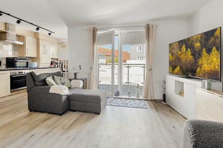 The open plan modern fitted kitchen features integrated appliances opening on to a spacious lounge/diner with French doors that lead out onto a rear private balcony. This outdoor space offers an area where you can enjoy al fresco dining or simply relax with a cup of coffee and glass of wine.