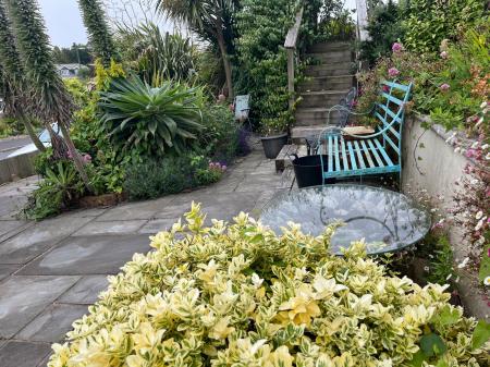 FRONT GARDENS Patio garden area with inset shrubs.