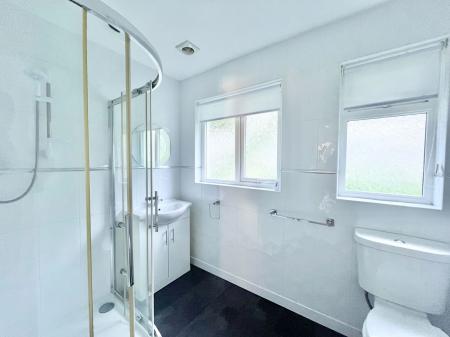 SHOWER ROOM A contemporary shower room with natural light from two opaque double glazed windows to the rear aspect. The suite comprises of a walk in shower cubicle with wall mounted shower system and tiled splash back wall areas. Wash hand basin set to vanity storage unit. Low level W.C with a push button flush. Tiled wall areas.