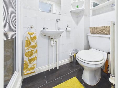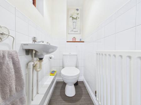 CLOAKROOM A convenient ground floor cloakroom comprising a low level WC and a wall mounted wash hand basin, complemented by part tiled walls and an obscure double glazed window.