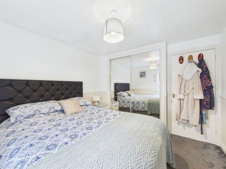 BEDROOM ONE A well proportioned principal bedroom positioned to the front of the property, featuring built in mirrored wardrobes, a double glazed window, and a gas central heating radiator. A door leads through to