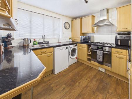 KITCHEN A well proportioned kitchen fitted with a range of wall, base and drawer units with roll edge work surfaces over. Features include a 1½ bowl stainless steel sink and drainer, an integrated electric oven with grill, and a four ring gas hob with extractor hood above. There is also a deep fitted larder cupboard, tiled splashbacks, and space and plumbing for a washing machine, dishwasher, and under counter fridge. A double glazed window provides natural light, and there is a gas central heating radiator.