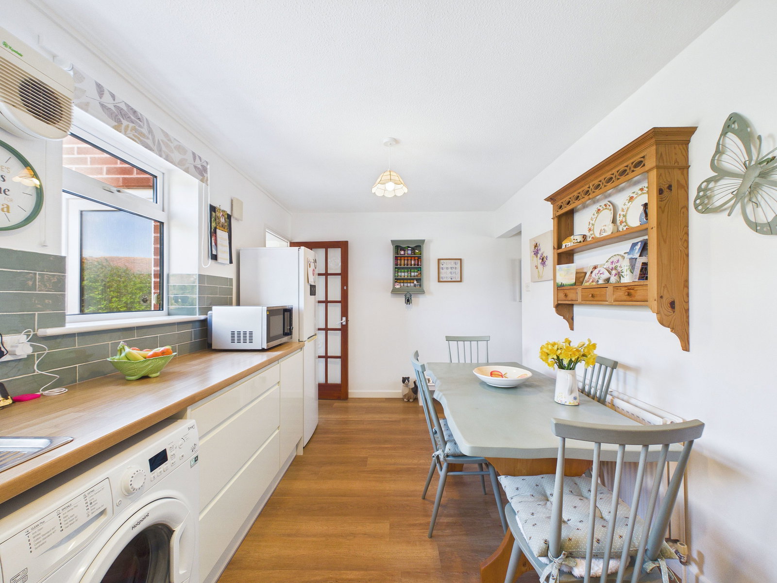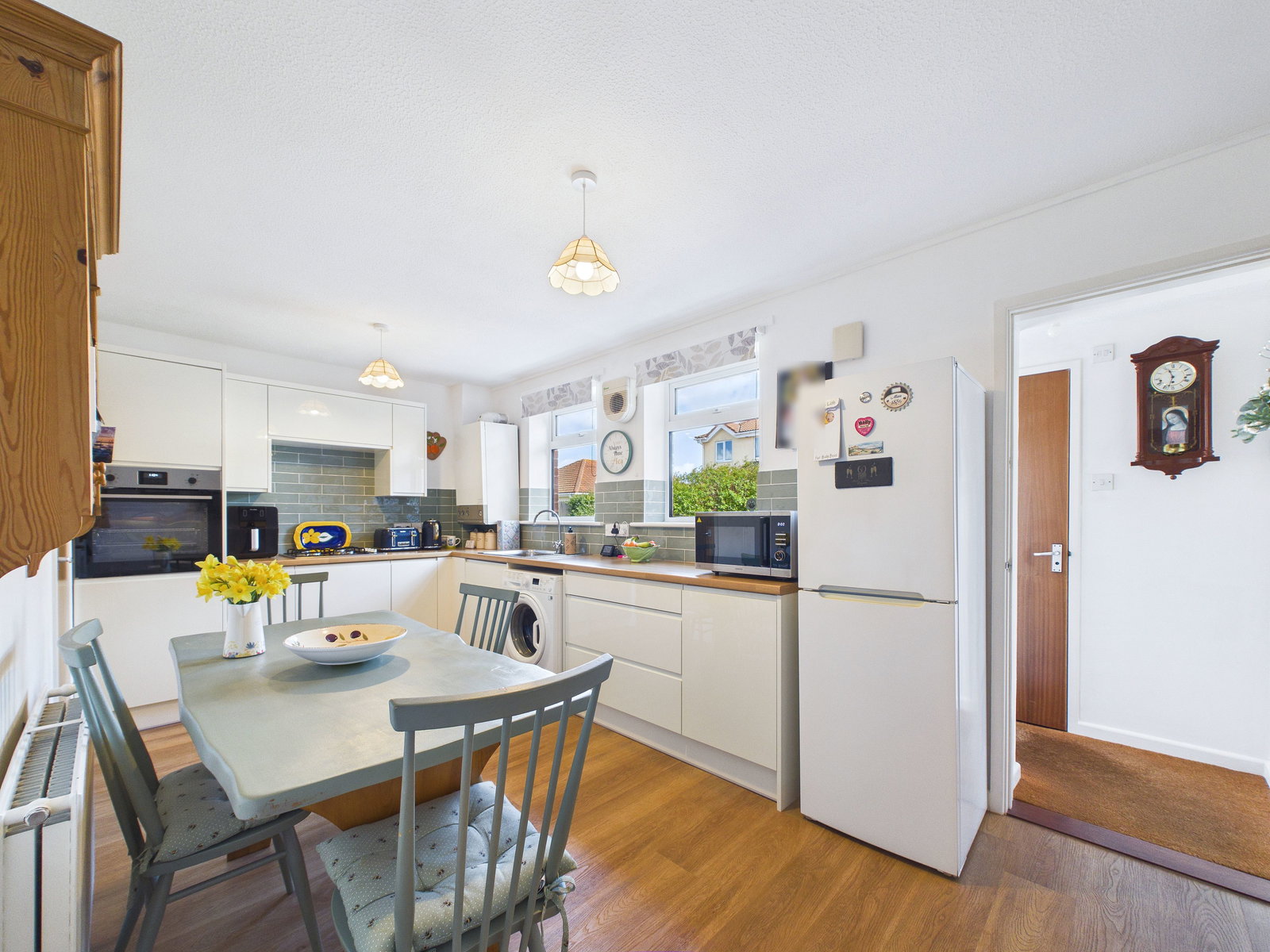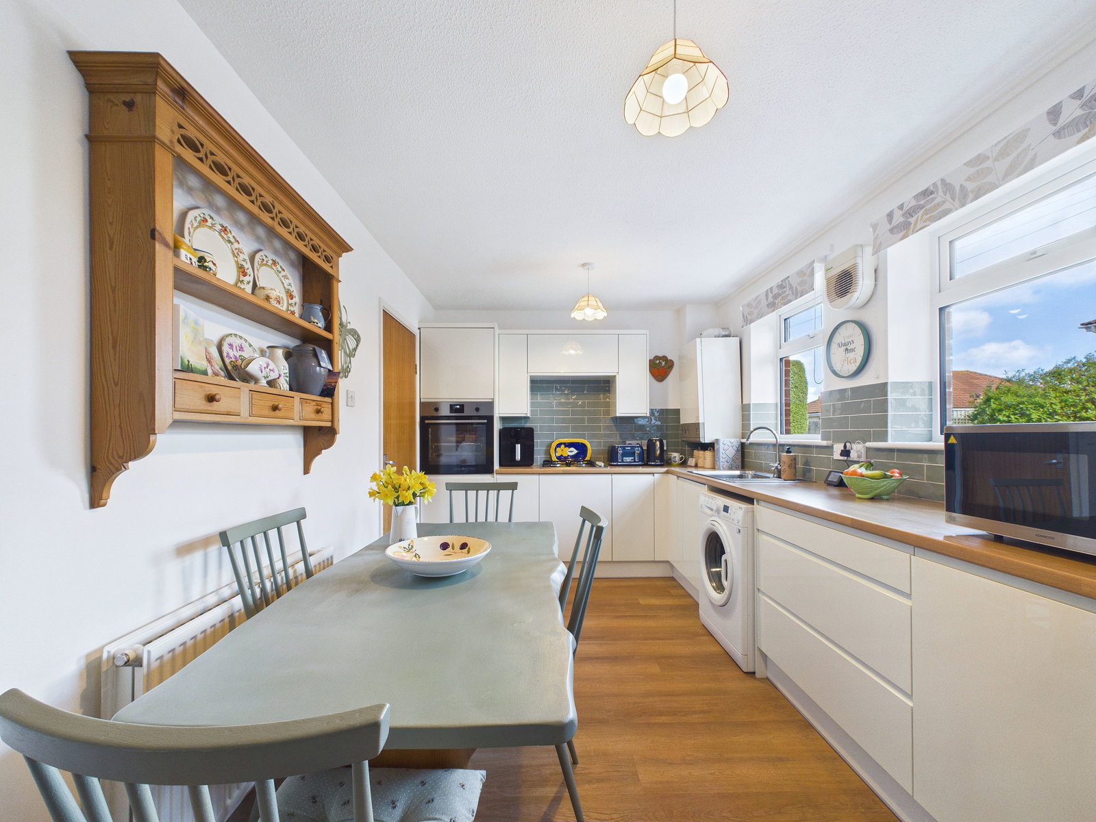 KITCHEN/DINER A stylish and contemporary kitchen/dining space, ideal for both family living and entertaining. The kitchen is fitted with a range of high gloss wall, base and drawer units with roll edge work surfaces over. Integrated appliances include a single electric oven with grill and a four ring gas hob with extractor hood above. There is also a 1 bowl stainless steel sink with drainer, along with space and plumbing for a washing machine and fridge freezer. The room comfortably accommodates a 6 seater table and the kitchen is complemented by a tiled splashback, a deep fitted pantry/storage cupboard, and a wall mounted boiler. Two uPVC double glazed windows and a gas central heating radiator
