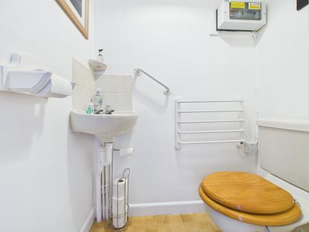 CLOAKROOM A practical ground floor cloakroom comprising a low level WC and wall mounted wash hand basin. Additional features include a fuse board, extractor fan, and towel rail.