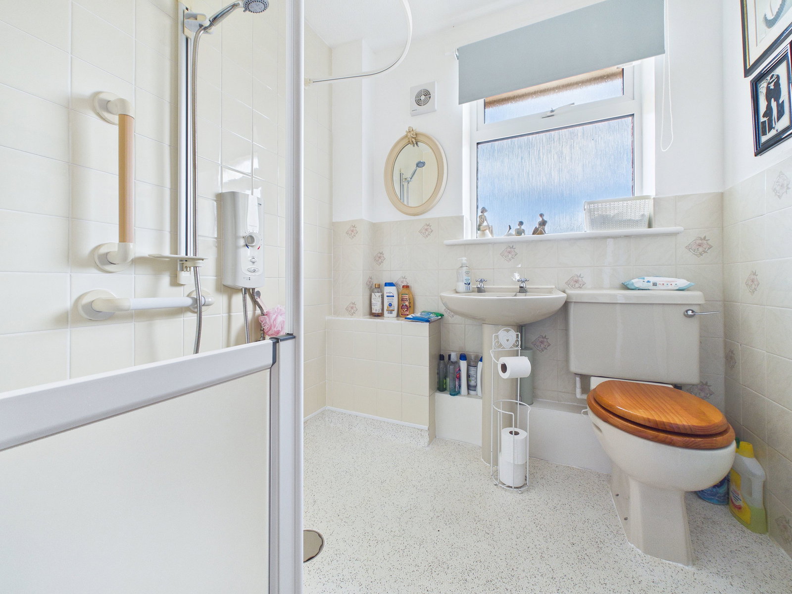 SHOWER ROOM A wet room style shower room fitted with a low level WC, pedestal wash hand basin and wall mounted shower with wet room style flooring. Tiled walls, uPVC obscure double glazed window, extractor fan and gas central heating radiator.