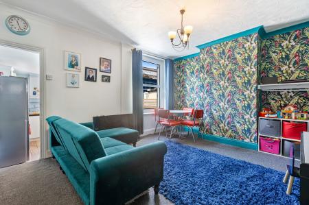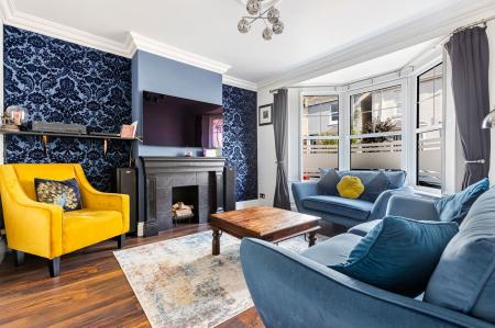 LIVING ROOM A bright and spacious reception room offering ample space for furnishings. This charming room features a decorative open fireplace, beautifully restored period details including cornicing, coving, and architraving, a uPVC double glazed bay window and a gas central heating radiator.