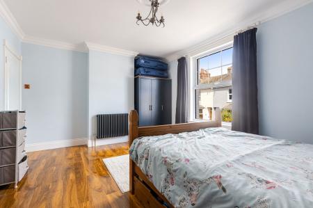 BEDROOM ONE A superbly spacious master bedroom to the front of the property offering an abundance of room and natural light through a uPVC double glazed window, beautiful reinstated period features including cornicing, coving, and architraving, and a gas central heating radiator.