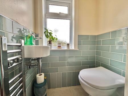 CLOAKROOM A practical downstairs cloakroom with a low level flush WC and wall mounted wash hand basin. Features include complimentary tiling, an extractor fan and an obscure uPVC double glazed window.