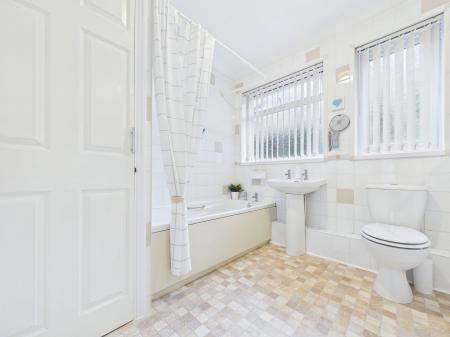 BATHROOM Family bathroom with panelled bath, shower screen, pedestal wash basin, low level WC, partly tiled and uPVC double glazing.