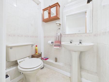 CLOAKROOM A convenient guest cloakroom fitted with a low level WC, pedestal wash hand basin, tiled walls and extractor fan.