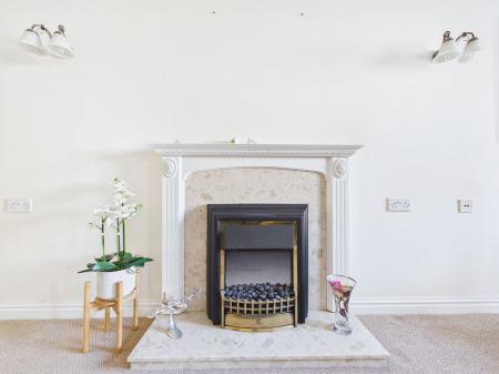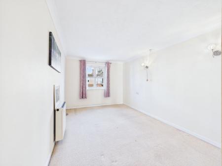 LIVING ROOM A bright and generously proportioned living room offering ample space for both lounge and dining furniture. Features include an attractive electric fireplace, TV point, wall mounted lighting and an emergency pull cord. A uPVC double glazed door opens onto a Juliet balcony with an additional side window, allowing for plenty of natural light. Night storage heater.