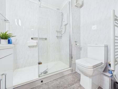 SHOWER ROOM A contemporary shower room comprising a low level WC, vanity wash hand basin with storage beneath and a double walk in shower. Finished with modern PVC panelled walls, extractor fan and a white heated towel rail.