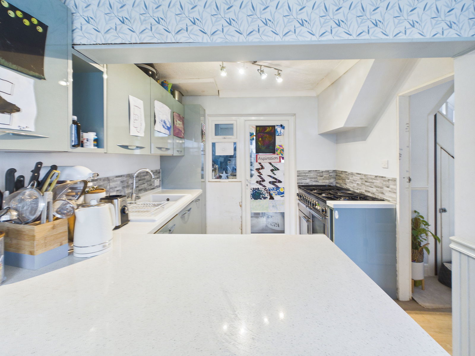 The kitchen is fitted with a range of overhead, base and drawer units topped with quartz work surfaces. Features include a 1.5 bowl ceramic sink and drainer, integrated dishwasher and a Rangemaster gas cooker with a five ring hob and hot plate, along with space for a fridge freezer.