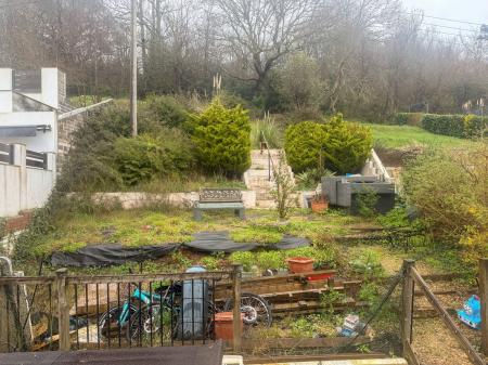 REAR GARDEN An exceptionally large rear garden offering significant potential for a new owner to personalise and enhance. A patio area accessed from the utility room, with steps then leading to a second tier laid with decorative pebble stones, with further steps rising to a generous lawned area bordered by mature shrubs and plants.
