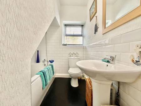 BATHROOM A contemporary family bathroom boasting a low level flush WC, a pedestal wash hand basin and a panelled bath unit with shower attachments above. Complimentary part tiled walls and a uPVC obscure double glazed window.