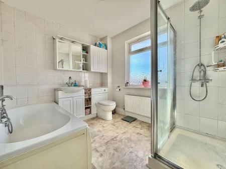 BATHROOM An incredibly spacious family bathroom boasting a four piece suite comprising of a low level flush WC, a vanity wash hand basin with fitted storage below, panelled bath unit and a further separate double walk in shower unit. Tiled walls, uPVC obscure double glazed window and a gas central heated radiator.