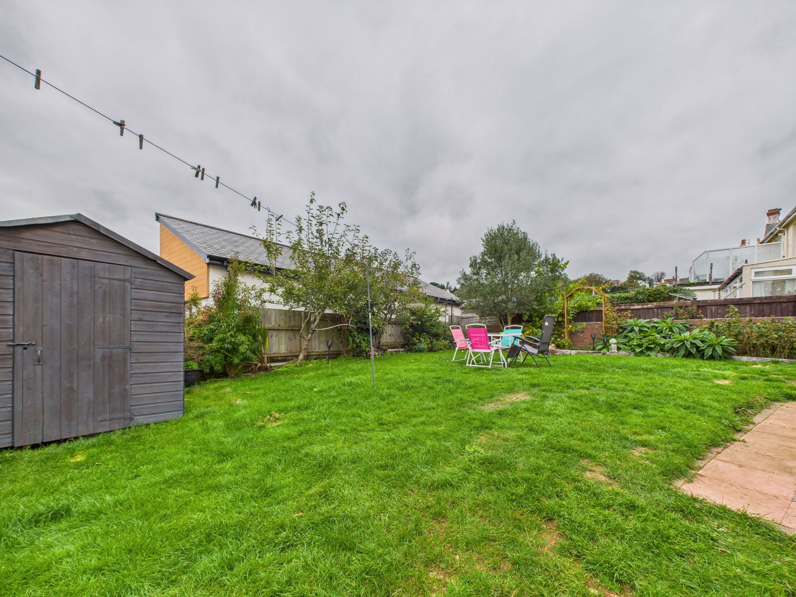 OUTSIDE The west facing is bathed in afternoon and evening sun. Mostly laid to lawn with a patio area, perfect for al fresco dining, alongside mature shrubs and planting, a timber built shed, and useful side access.