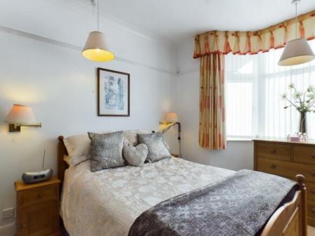 BEDROOM ONE - 4.17m x 3.68m (13'8" x 12'1") uPVC double glazed bay window with outlook to the front. Radiator, power points, picture rails, coved ceilings and wall light points. Vanity unit with inset wash hand basin with cupboards below and tiled splashback.