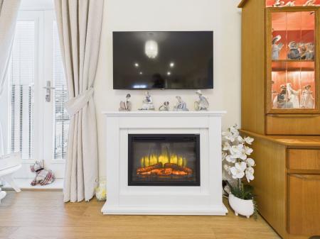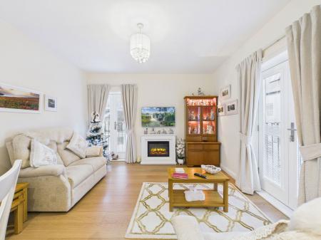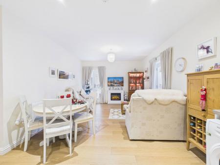 THE LIVING/DINING area enjoys space for ample furniture, a feature electric fireplace, tv and internet points, double aspect upvc double glazing with two Juliet balconies overlooking the outdoor communal space and an electric radiator.