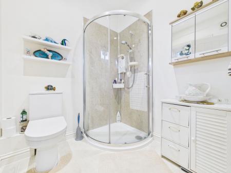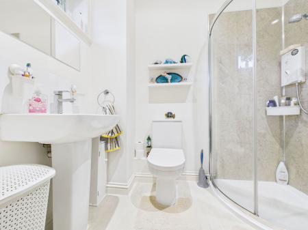 SHOWER ROOM A contemporary shower room comprising of a low level flush WC, a pedestal wash hand basin and a corner shower unit. Extractor fan, complimentary PVC panelled walls, a upvc obscure double glazed window and a chrome heated towel rail.