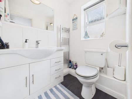 FAMILY BATHROOM This well sized family bathroom offers a three piece suite including a panelled bath with shower and glass screen, vanity basin with storage below and low level flush WC. Additional features include a chrome heated towel rail, shaver point and an obscure uPVC double glazed window.