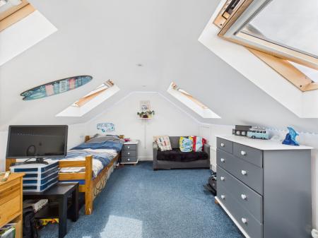BEDROOM TWO A large and inviting double bedroom with dual aspect Velux windows providing plentiful natural light. Ample space for furnishings, a fitted storage cupboard, side storage in the eaves on both sides and a gas central heated radiator.