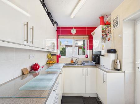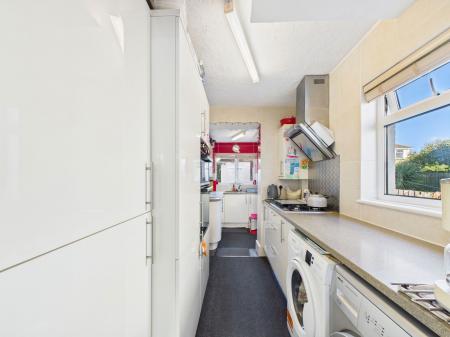 KITCHEN A spacious galley style kitchen appointed with an attractive range of high gloss fronted wall, base and drawer units complemented by roll edged work surfaces. The kitchen includes a 1½ bowl stainless steel sink with drainer, an integrated electric eye level double oven with grill, a five ring gas hob with extractor hood above and an integral fridge freezer. There is also space and plumbing for both a washing machine and dryer. Additional features include tiled splashbacks, a uPVC double glazed window overlooking the beautifully maintained rear garden and a uPVC door providing direct garden access.