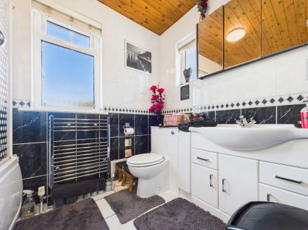 BATHROOM A three piece suite comprising a low level WC, a vanity wash hand basin with fitted storage below and a panelled bath with overhead shower and glass screen. Additional features include tiled walls, a uPVC double glazed window and a chrome heated towel rail.