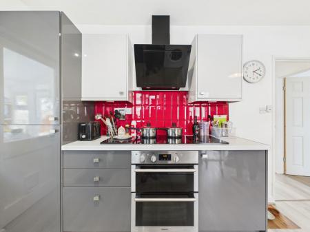 KITCHEN A modern kitchen equipped with a range of wall mounted, base and drawer units complemented by roll edged work surfaces. Includes a 1 1/2 bowl stainless steel sink with drainer, an integrated electric double oven with grill, four ring induction hob with extractor hood and an integral fridge freezer. Additional features include space and plumbing for a washing machine, a breakfast bar and a tiled splashback. A uPVC double glazed window looking into the conservatory, with doors leading to the conservatory and rear porch.