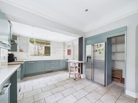 KITCHEN A large fitted kitchen boasting a range of overhead, base and drawer units with roll edged work surfaces above. A 1 1/2 bowl stainless steel sink and drainer unit, space and plumbing for a dishwasher, American fridge freezer, and further under counter appliance, tiled backsplash and flooring, a deep walk in pantry, double aspect uPVC double glazed windows and a uPVC double glazed door leading out to the gardens.