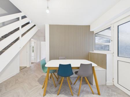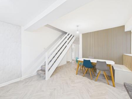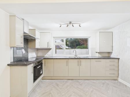 KITCHEN/DINER – 4.68m x 3.7m Bright and spacious kitchen/diner fitted with wall, base and drawer units, work surfaces, stainless steel sink, electric cooker, electric hob with extractor, and tiled splashbacks. Integrated dishwasher and a cupboard housing the combination boiler. Stairs to first floor, dual-aspect windows and door to the conservatory.