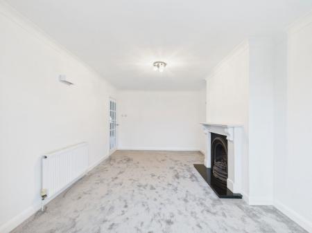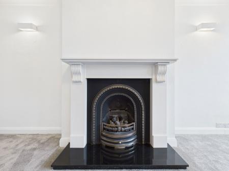 LIVING ROOM – 5.44m x 3.32m Spacious front-facing living room with bay window, feature gas fireplace, TV and internet points, and radiator.