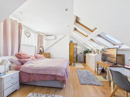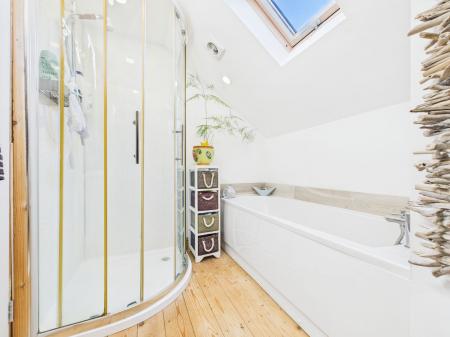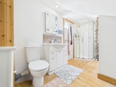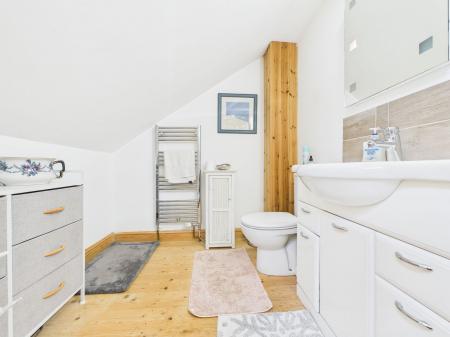 ENSUITE Quality modern suite comprising panelled bath, vanity basin and low level WC. Shower cubicle with electric shower. Double glazed Velux window and chrome heated towel rail.