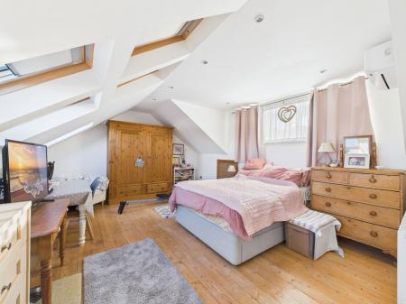 MASTER BEDROOM ENSUITE Stunning sea views across the bay, natural wood flooring, central heating radiator, uPVC double glazing, eaves storage and spotlighting.