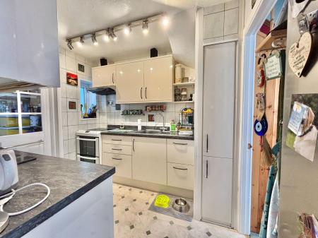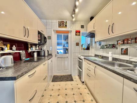 KITCHEN - 2.62m x 2.29m (8'7" x 7'6") A modern galley style kitchen boasting a range of overhead, base and drawer units with roll edged work surfaces above. A 1 1/2 bowl stainless steel sink and drainer unit, space for an electric cooker, dishwasher and fridge freezer. Tile backsplash, overhead lighting and a door leading into