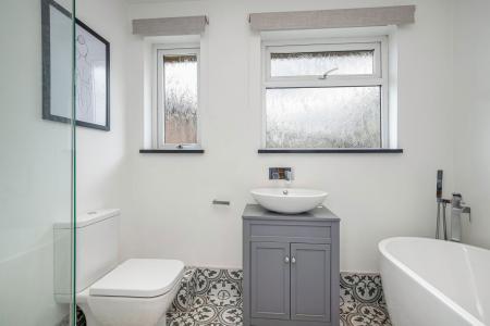 BATHROOM Comprising of a luxury four piece suite including a large walk in shower, WC, vanity wash hand basin, free standing bath, heated towel rail and double glazed windows to the rear aspect.