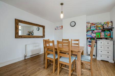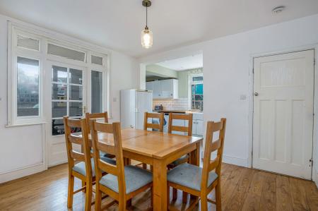 DINING AREA Original single glazed door and windows to the rear, radiator, laminate flooring and access through to the kitchen.
