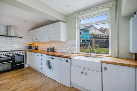 KITCHEN AREA A matching range of wall and base work units with oak work tops above, inset ceramic style Belfast double sink with mixer taps above, beko electric gas range oven and 7 ring hob and cooker hood above, part tiled walls, laminate flooring, appliance space for a washing machine, dishwasher and fridge freezer, wall mounted boiler, double glazed window to the side aspect over looking the garden and opening onto:-
